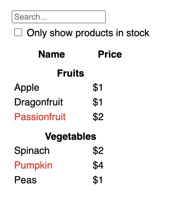 Anda dapat mulai melihat bagaimana aplikasi Anda akan berperilaku. Edit nilai awal filterText dari useState('') menjadi useState('fruit') pada kode sandbox di bawah ini. Anda akan melihat teks input pencarian dan tabel diperbarui: